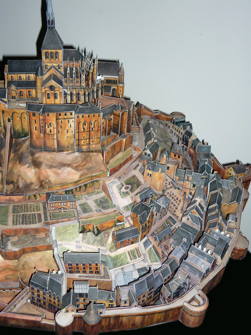 Mais j'ai étudié le monument et réalisé quelques modifications : la tour Cholet n'était pas couverte sur la maquette, alors que depuis 2001 je crois, elle a retrouvé son aspect ancien avec toit et pignon donnant sur l'intérieur. J'ai également reconstruit l'hôtellerie qui s'était écroulé lors d'un glissement de terrain (la plate-forme qui est maintenant retenue par les 4 contreforts), ainsi que l'église abbatiale telle qu'elle apparaissait (2 fois plus longue) flanquée des 2 tours avant l'incendie.