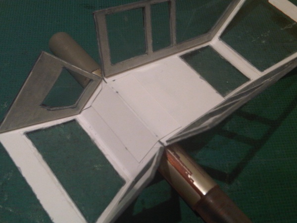 Les différentes pièces ainsi que les vitres et les renforts: Collage des vitres sur les renforts: Collage des renforts et des autres vitres: Le résultat: Et essai à blanc sur le cockpit