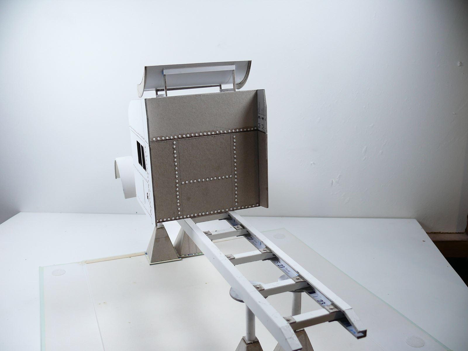 Fin du rivetage de la carrosserie, construction du spoiler et construction des pneus (un seul est pour l'instant revêtu de sa bande de roulement).