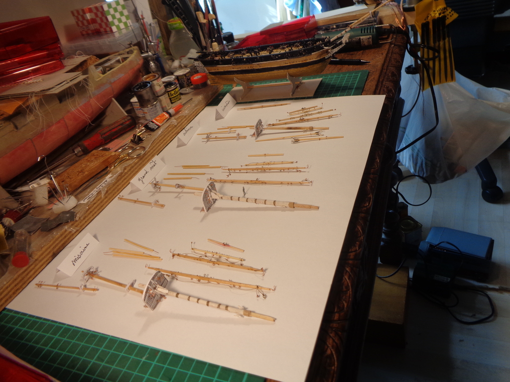 Je vais tout de suite mettre une planche qui concerne les vergues. Il y a encore loin pour les voir montées sur les mâts, mais il y aura beaucoup de travail de préparation. Les poulies sont à peu près toutes repérées, il y en a en trop sur les grandes vergues du grand mât et du mât de misaine.