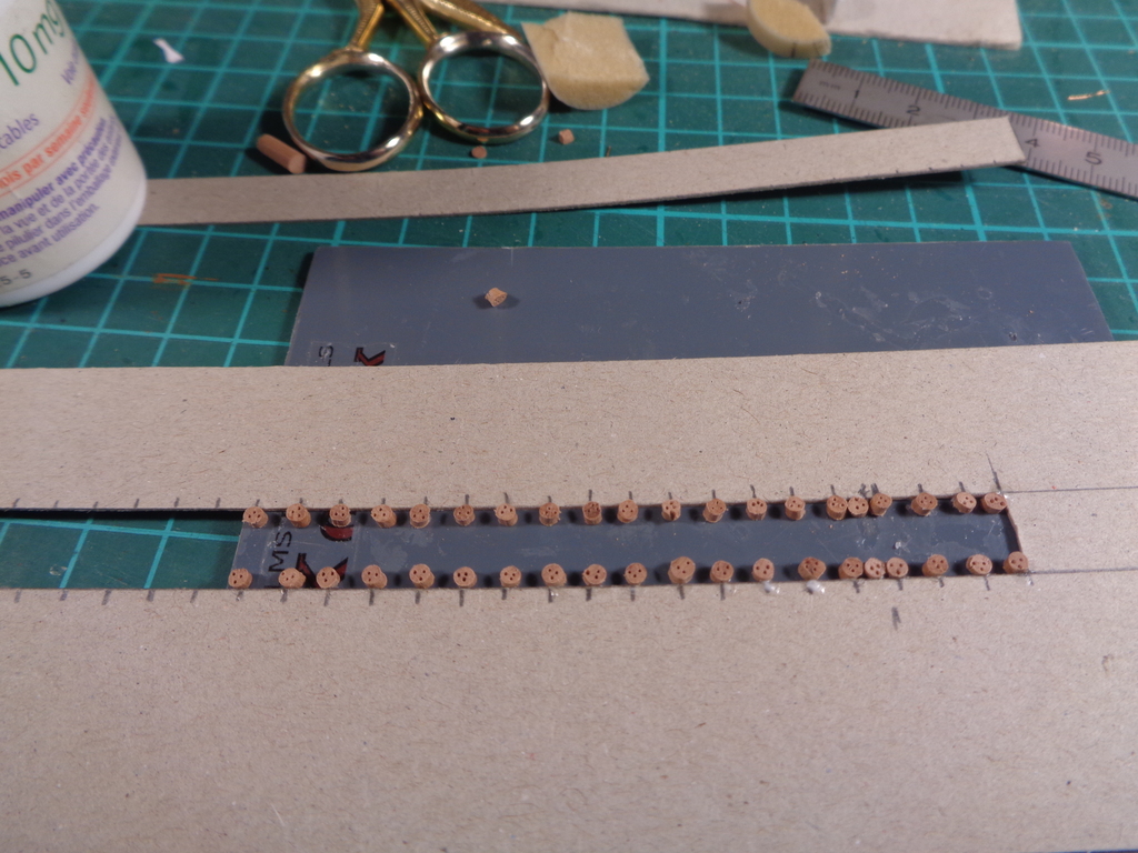 Je n'ai pas fait les caps de mouton en carton parce que si petits, je n'arrivais pas à les percer sans les abîmer. J'en ai fait d'autres , mais plus gros et ça semble marcher. Ce sera pour un autre navire. Je suis allé voir ce que c'était que le carton "finlandais" et où on en trouvait, mais j'ai trouvé que c'est bien cher pour un loisir comme le nôtre.