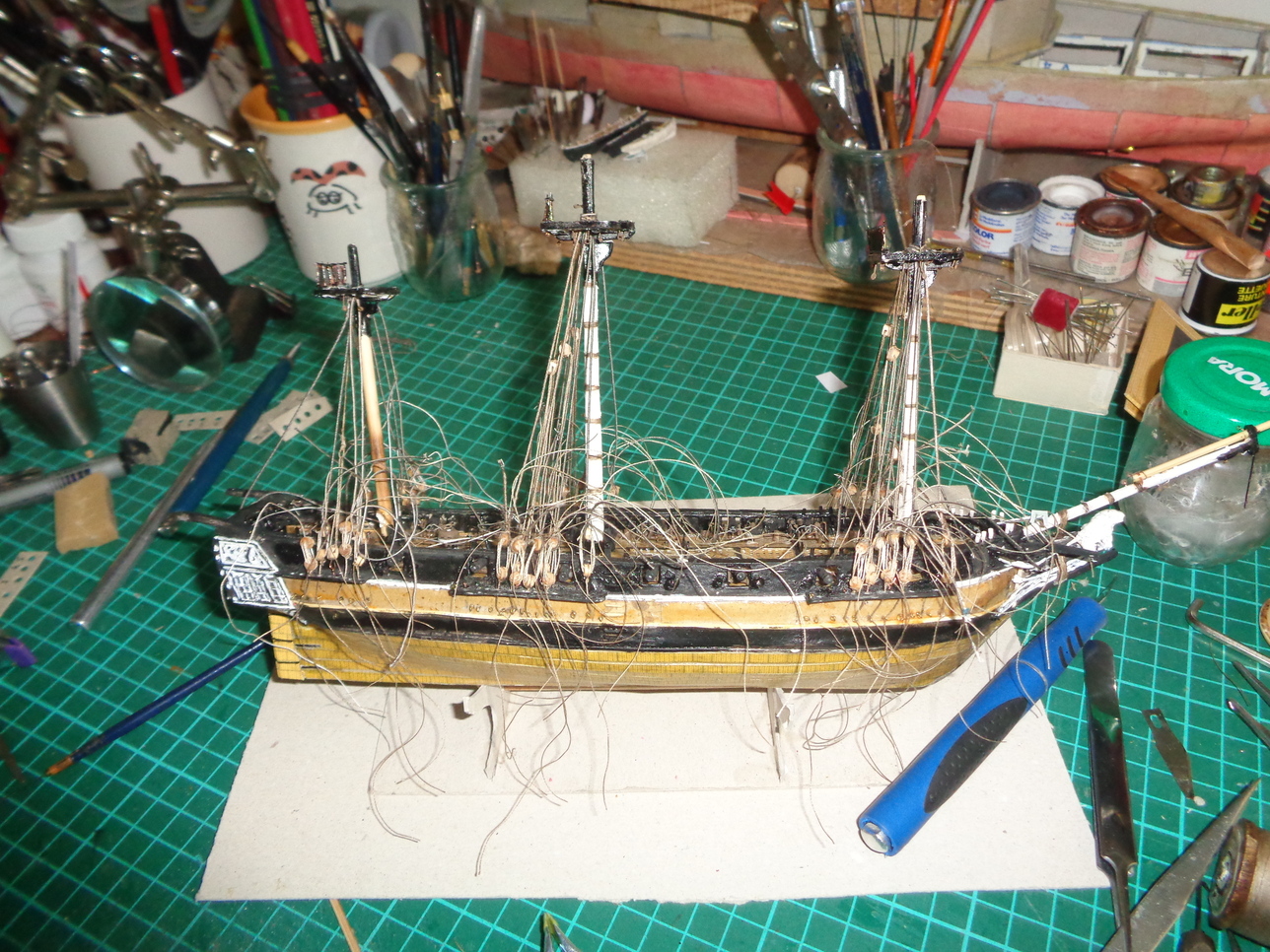 C'est tout pour ce soir. J'ai des câbles à trois et quatre brins qui sèchent partout autour de moi. Mes araignées se sentent chez elles dans mon bureau! Je vais pouvoir procéder à la pose des haubans et des caps de moutons que j'ai refaits en plus petits, un peu moins hors d'échelle.....