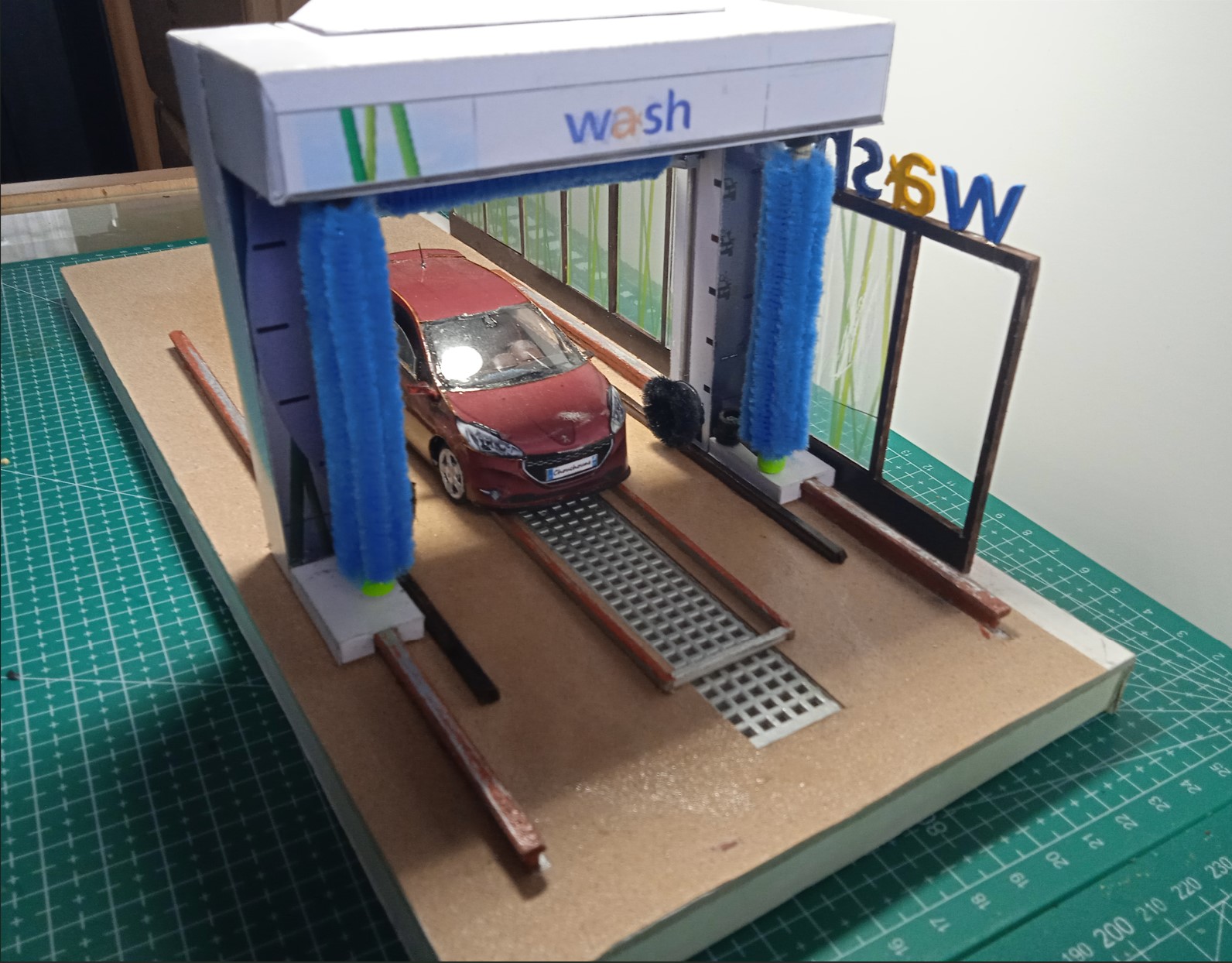 Je vous présente une partie du coin lavage automobile , le lavage a rouleau , le tout est mobile mais il manque encore des pièces que je n'ai pas fini et les rouleaux sont provisoirement posés d'où les calles carré au bas.
