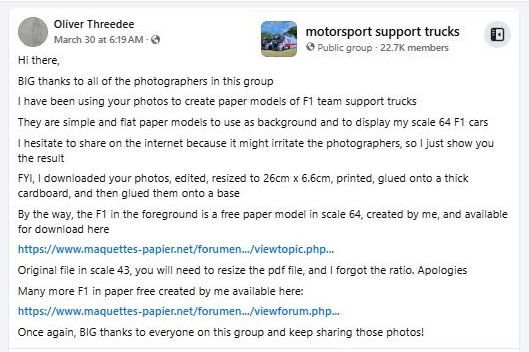 Des camions motorhomes F1 en 2D a l'echelle 1/64eme en vue de creer des arriere-plans sympathiques pour mes petites F1 en papier ou en zamac