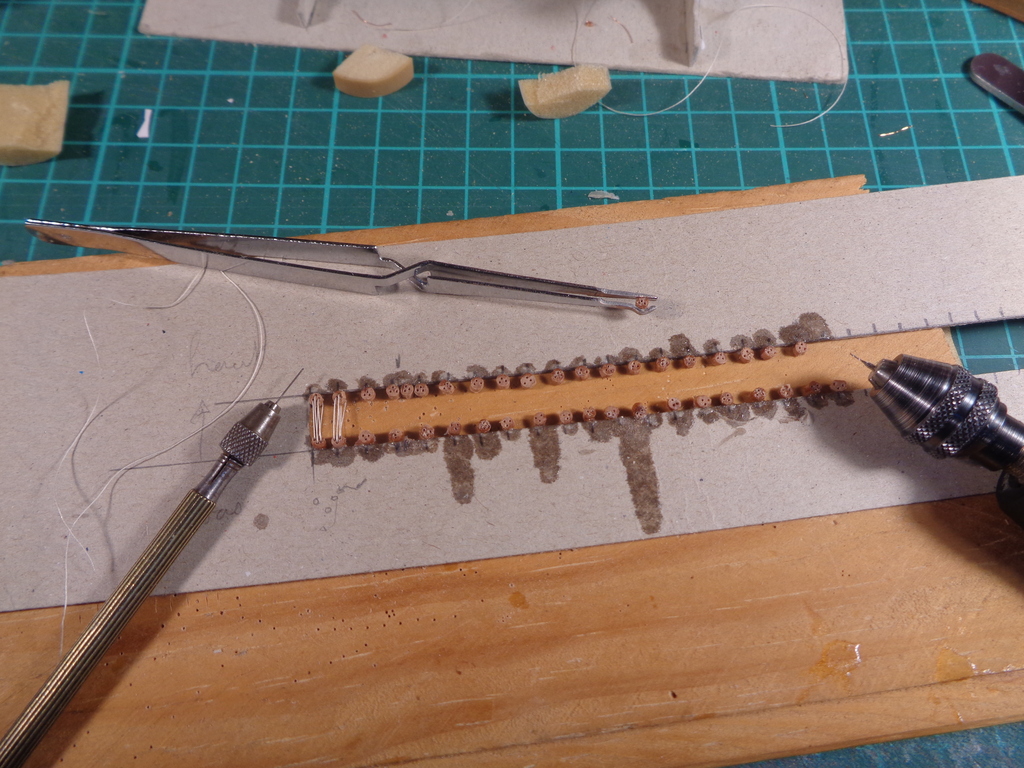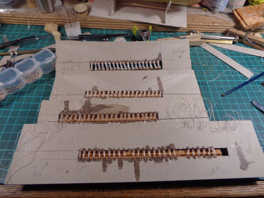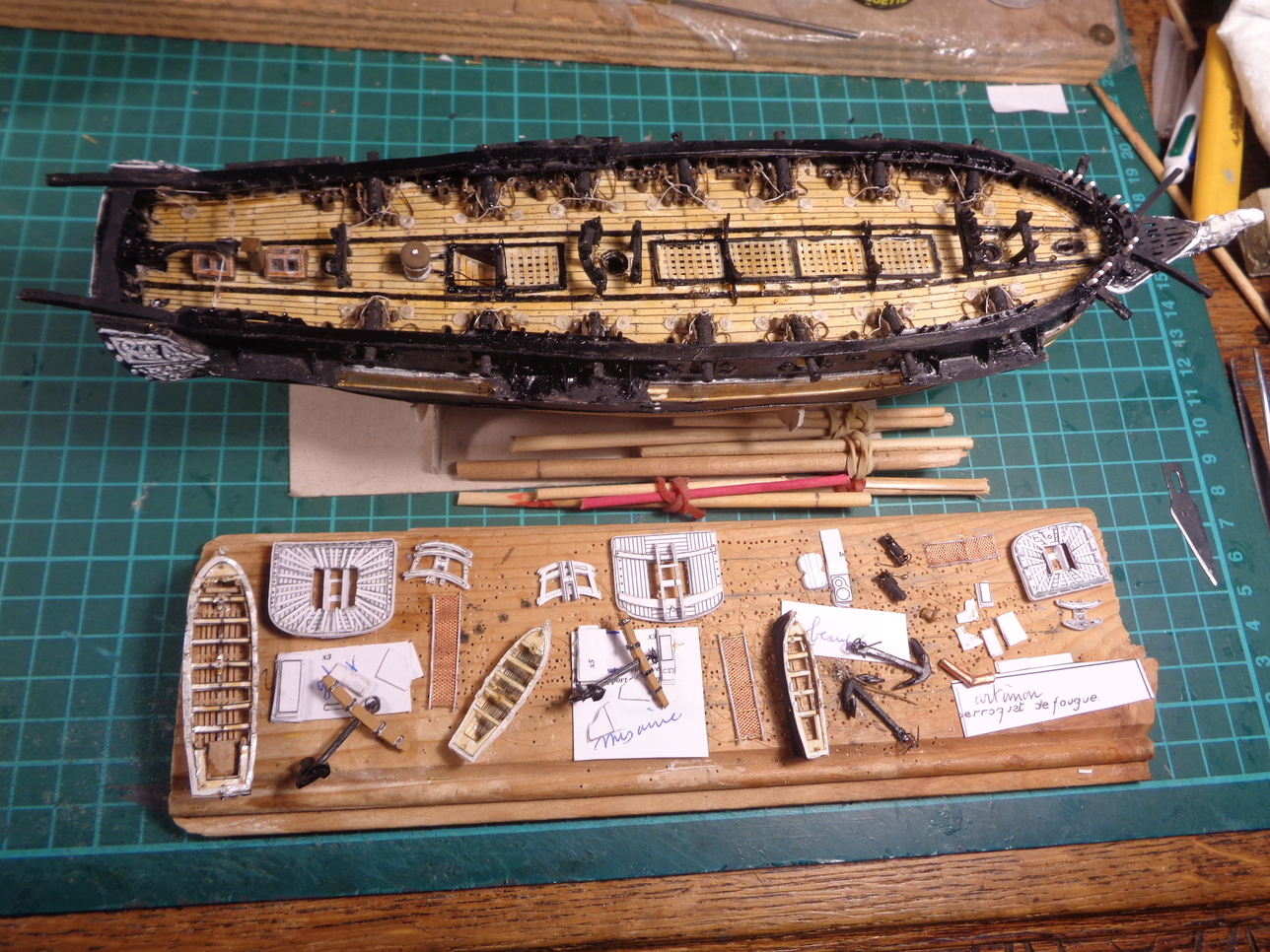 Comment monter un garde fou. Le truc orange, c'est de la mousse d'emballage. La barre faisant environ 1 mm de large, c'est difficile à tenir! Voici toutes les pièces quasiment réunies avant le début de la construction des mâts. Ce sera le début d'un type de "travail" très différent. C'est quasiment fini en ce qui concerne le papier. J'ai rajouté des grilles de protection sur les fenêtres vers la barre. Le tas de morceaux de bois sont ce qui servira bientôt, tout de la récupération, et il y en aura sans doute encore d'autres avant la fin. J'ai "perdu" beaucoup de temps sur ce qui va venir parce que je voulais des pièces pas trop hors d'échelle; J'ai utilisé des trucs que je vous expliquerai le moment venu. Si vous voulez faire un beau modèle pour une occasion ou un cadeau, prenez vous y très en avance ! Tout est minutieux et il ne faut pas insister quand ça ne va pas.... Un foret de 0,2 ou 0,3 mm pénètre le doigt aussi facilement qu'une aiguille fine de seringue. Le modèle n'est pas grand, le voici avec un cube repère Et pour se faire plaisir, le pont Ce sera tout pour aujourd'hui, passez une bonne soirée!