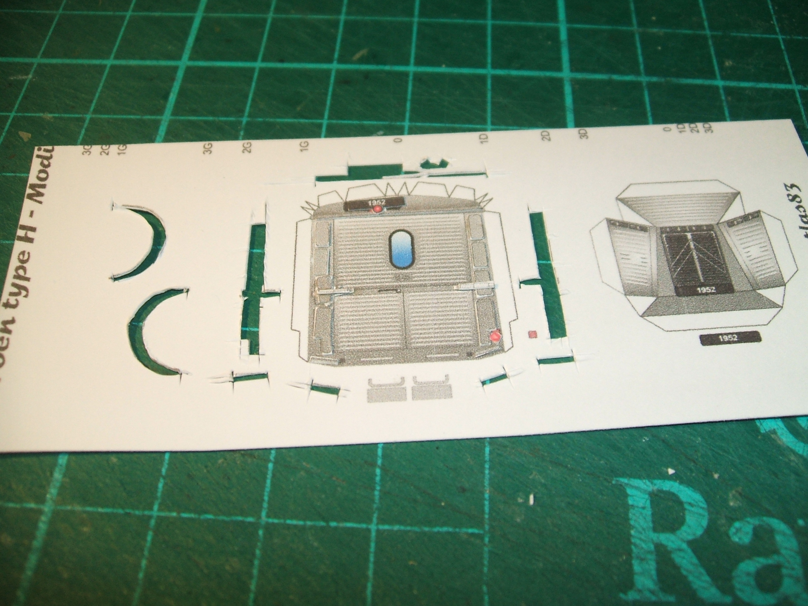 Voici les capots; à cette échelle, toutes les languettes sont proscrites sur les petites pièces. Les pièces à rapporter sont découpées Il faut faire très attention aux marques de pliage. Les erreurs sont amplifiées par l'échelle. Il vaut mieux souvent refaire une pièce que la modifier ou reprendre un pliage.