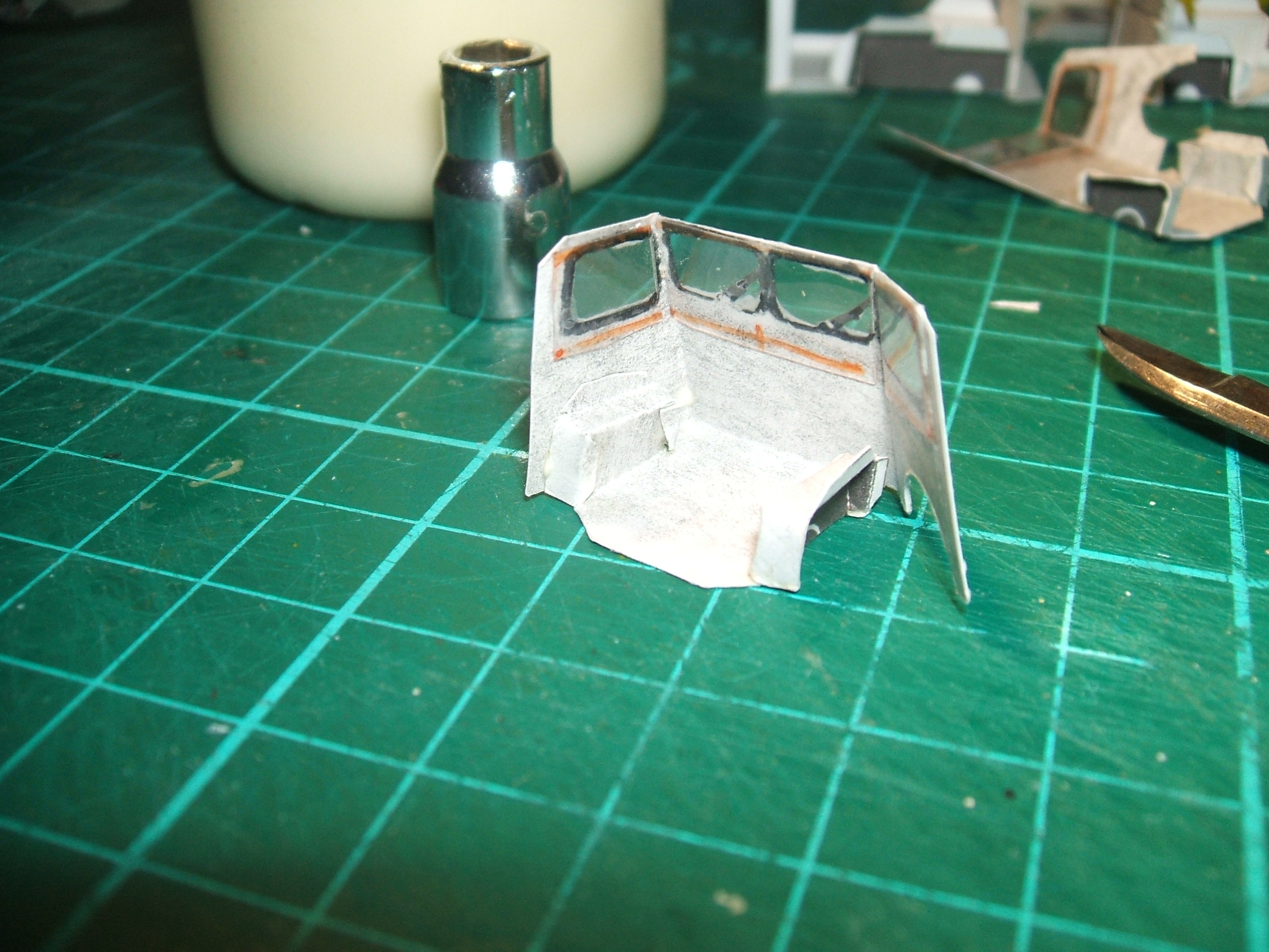 Le collage bord à bord du capot avec des cales les deux faces arrières avec les reliefs rapportés et les lunettes évidées. Au dos, il y a un renfort de carton 0.6 mm collé. Le collage de la caisse en sera facilité. La petite vitre arrière est collée à la uhu colle tout et une petite pièce de papier la bloque proprement en place. Suite au prochain envoi.