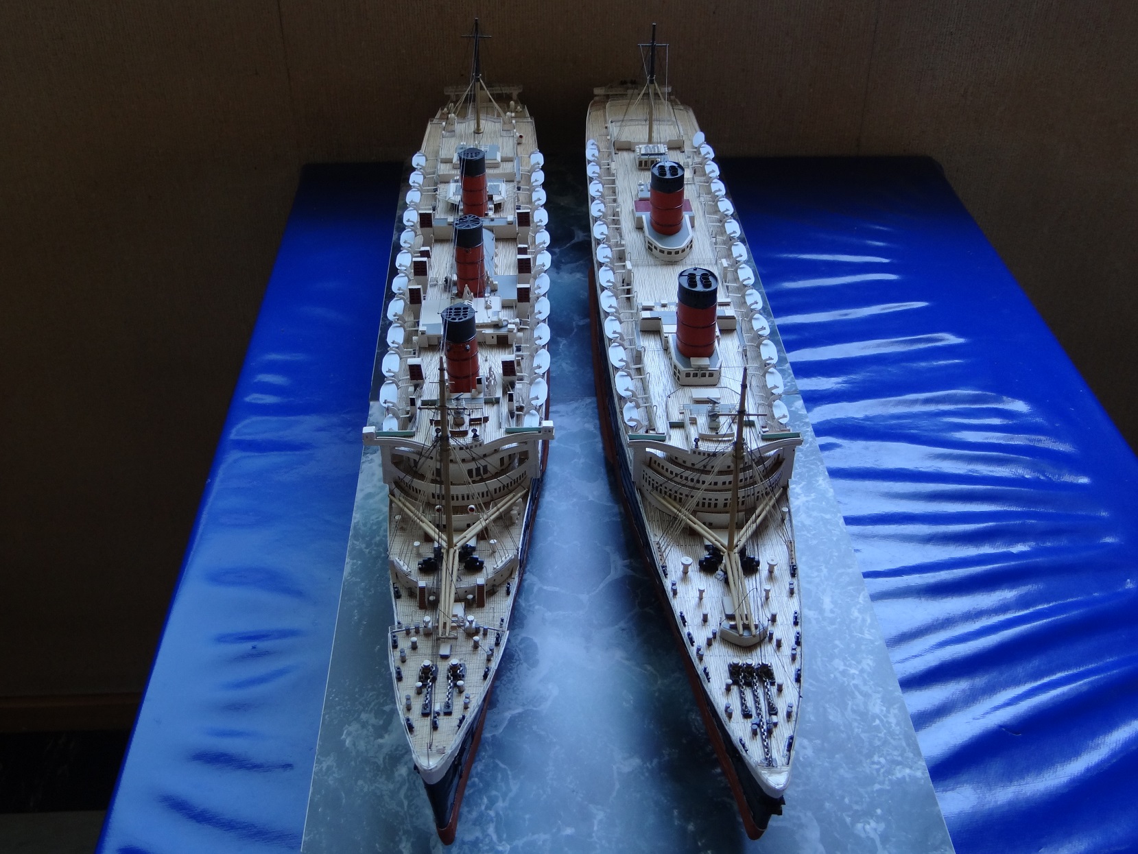Pour commencer, les paquebots Queen Mary et Queen Elisabeth réalisés en bristol et balsa principalement et quelques photo découpes en acier pour les rembardes. Le tout au 1/400.