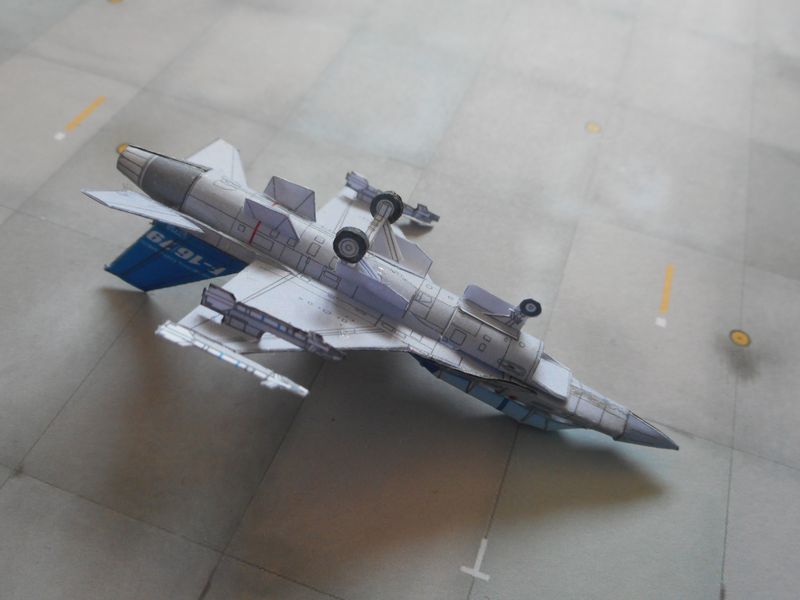 - 1 YF-16 que je ne finirai probablement jamais car l'avant du fuselage (sans radar donc plus pointu) est à revoir et qu'il faut réduire un peu les ailes et l'empennage horizontal.Et je manque de doc pour faire les modifs.Si je le finis, je supprimerai probablement toutes les lignes de structure.