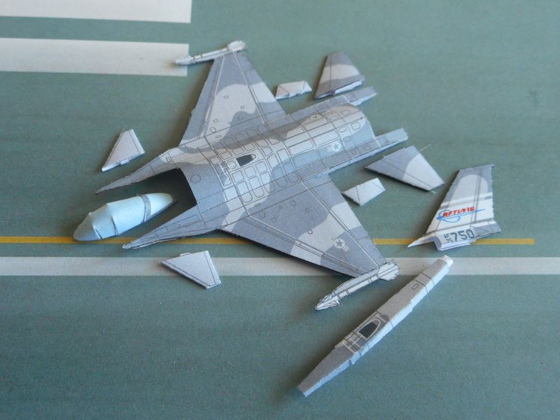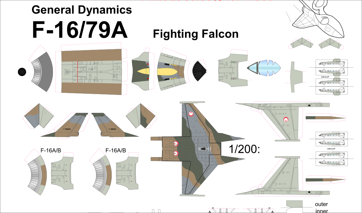 Voici le F-16 AFTI dans sa configuration initiale (mais sans le parachute anti-vrille et son échafaudage). Le pdf a quelques modificationss mineures par rapport au modèle monté (avant de l'épine dorsale, couleur des repères du réceptacle de ravitaillement en vol et ajout d'une 2ème antenne qui va devant le train avant, sous l'entrée d'air. Deux options pour les missiles en bout d'aile.