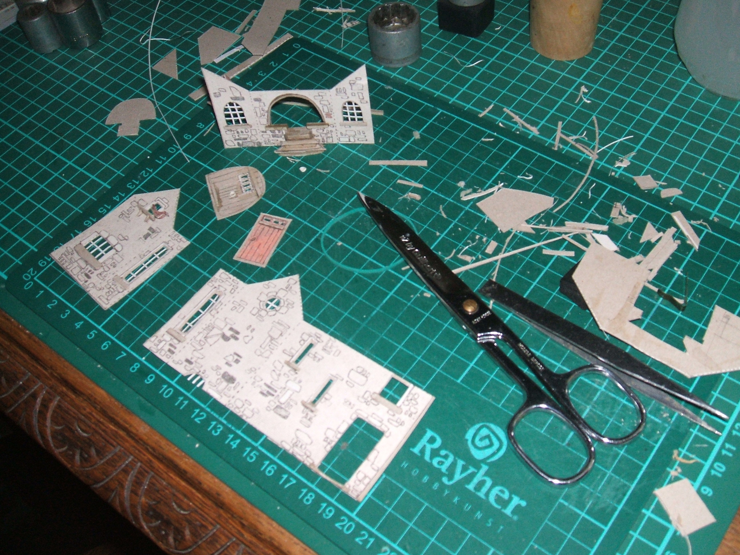 voici les pièces en cours de découpage. Une des roues est évidée; les volets, les encadrements de fenêtres sont évidés.