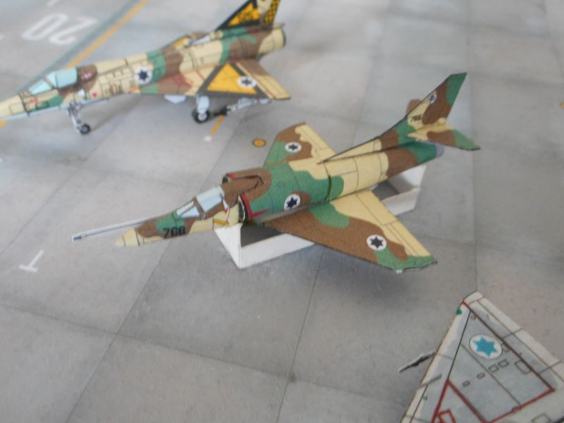 Voici un A-4H Skyhawk israélien utilisé pendant la guerre du Kippour. Il était affecté à l'escadron d'entraînement avancé de l'école de pilotage (dont il porte l'insigne) mais a été transféré au squadron 102 dès le début du conflit. Il a été perdu au combat le 9 octobre 1973.