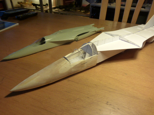 Bonjour , la partie avant est pratiquement terminée , le dièdre des ailes sera corrigé ( ailes actuellement non collées ) lorsque la partie arrière sera collée à l'ensemble .