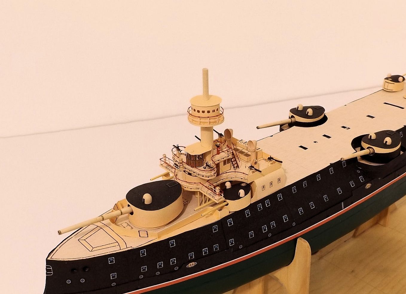 Jean-Pierre: Je réserve la peinture aux seuls petits détails, et 90% des couleurs viennent directement de l'imprimante seule. Seule la quille a été à la fin entièrement peinte en vert ("vert de Schweinfurt" à l'époque).