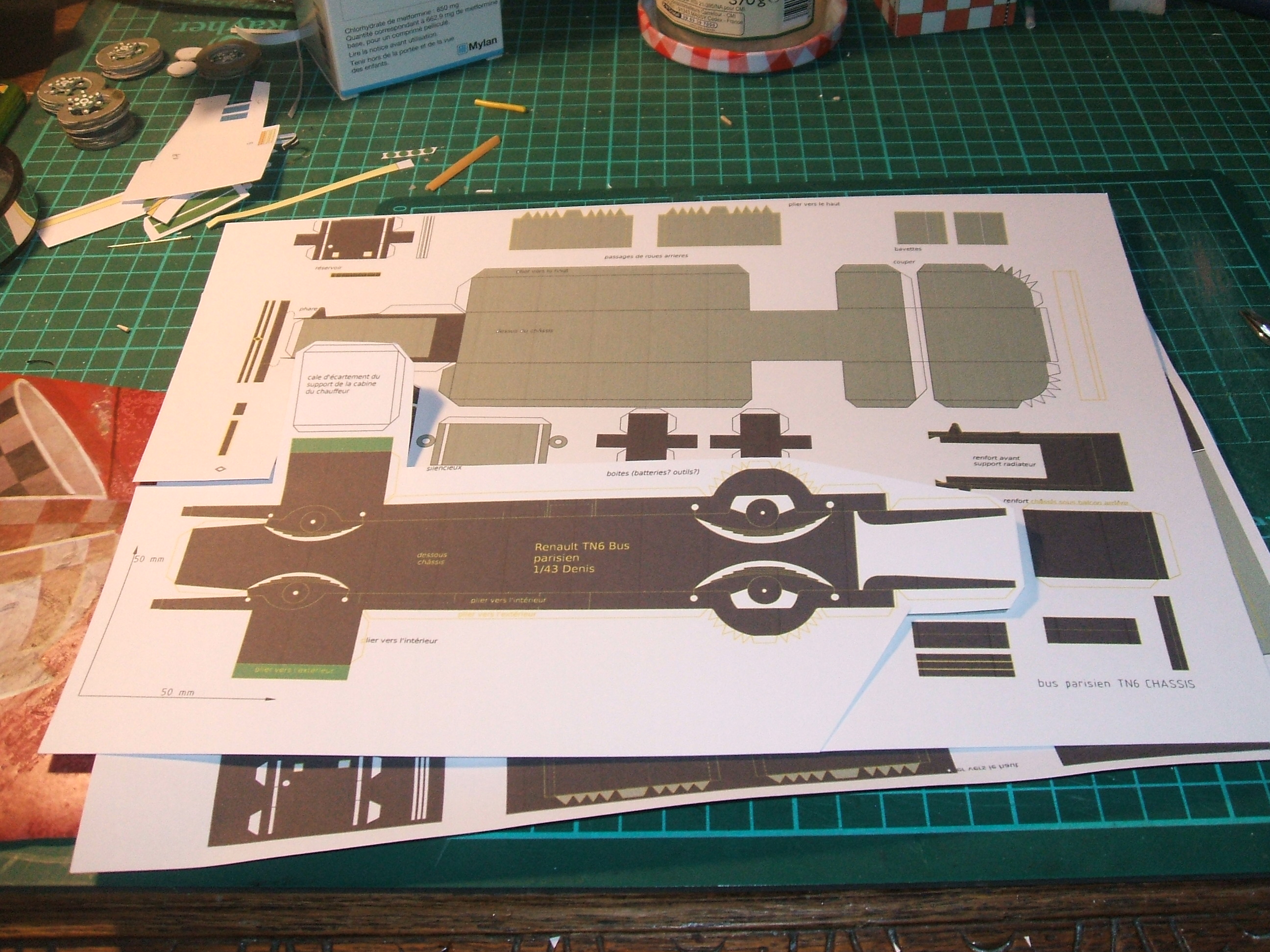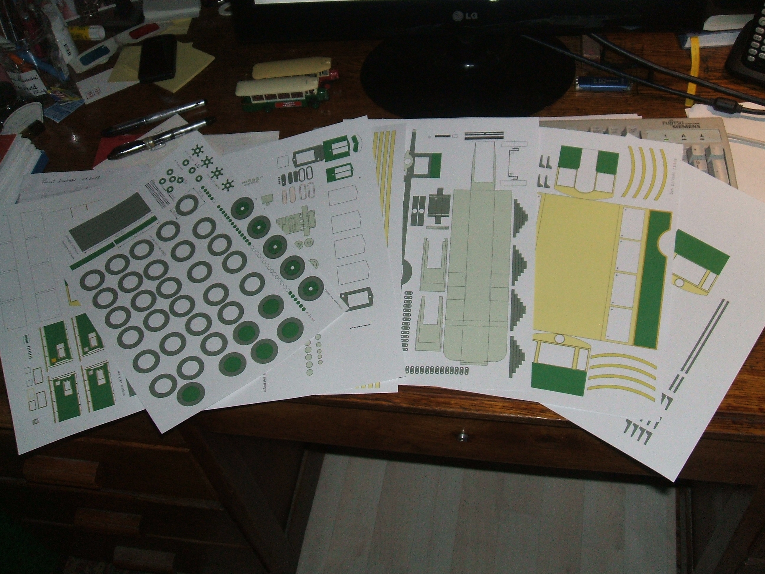 Les planches pour l'aménagement intérieur sont en cours (sièges, cabine chauffeur, moteur boite et le reste) pour le modèle qui me plaît vraiment mais qui inclura un peu de métal et qui n'est plus du découpage (voir mon interprétation de la traction de Camille.