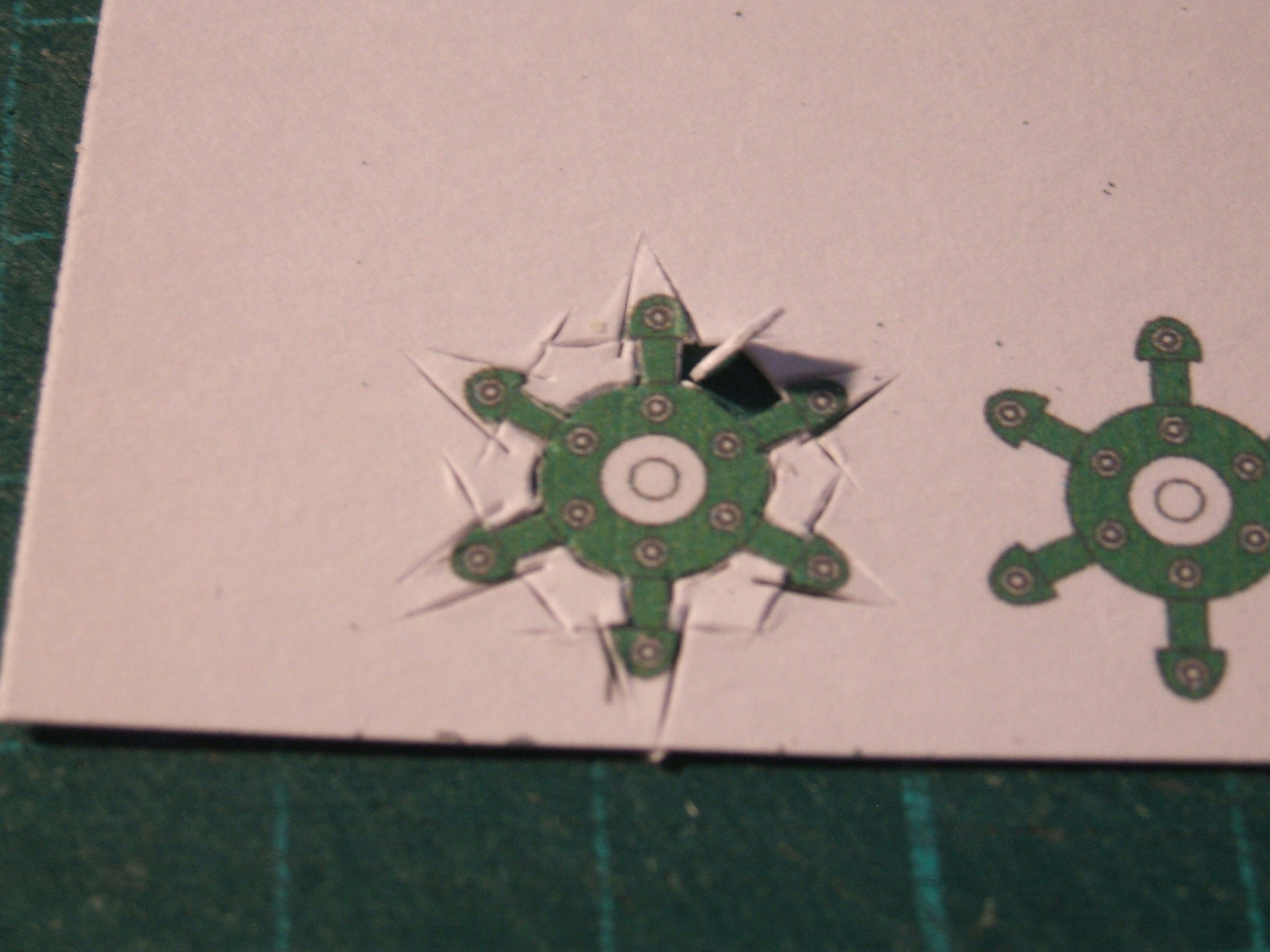 Voici la découpe la plus rapide que j'ai trouvée; début: puis le tour du moyeu; deux fois entre les pattes pour éviter de les couper: ensuite le long des pattes: et les dernières découpes Il suffit alors de découper le tour et de dégager la petite pièce. Plus le cutter est fin, mieux ça marche. Pour ceux que ça gênerait, la pièce est dessinée sur certaines roues, alors ça peut suffire!