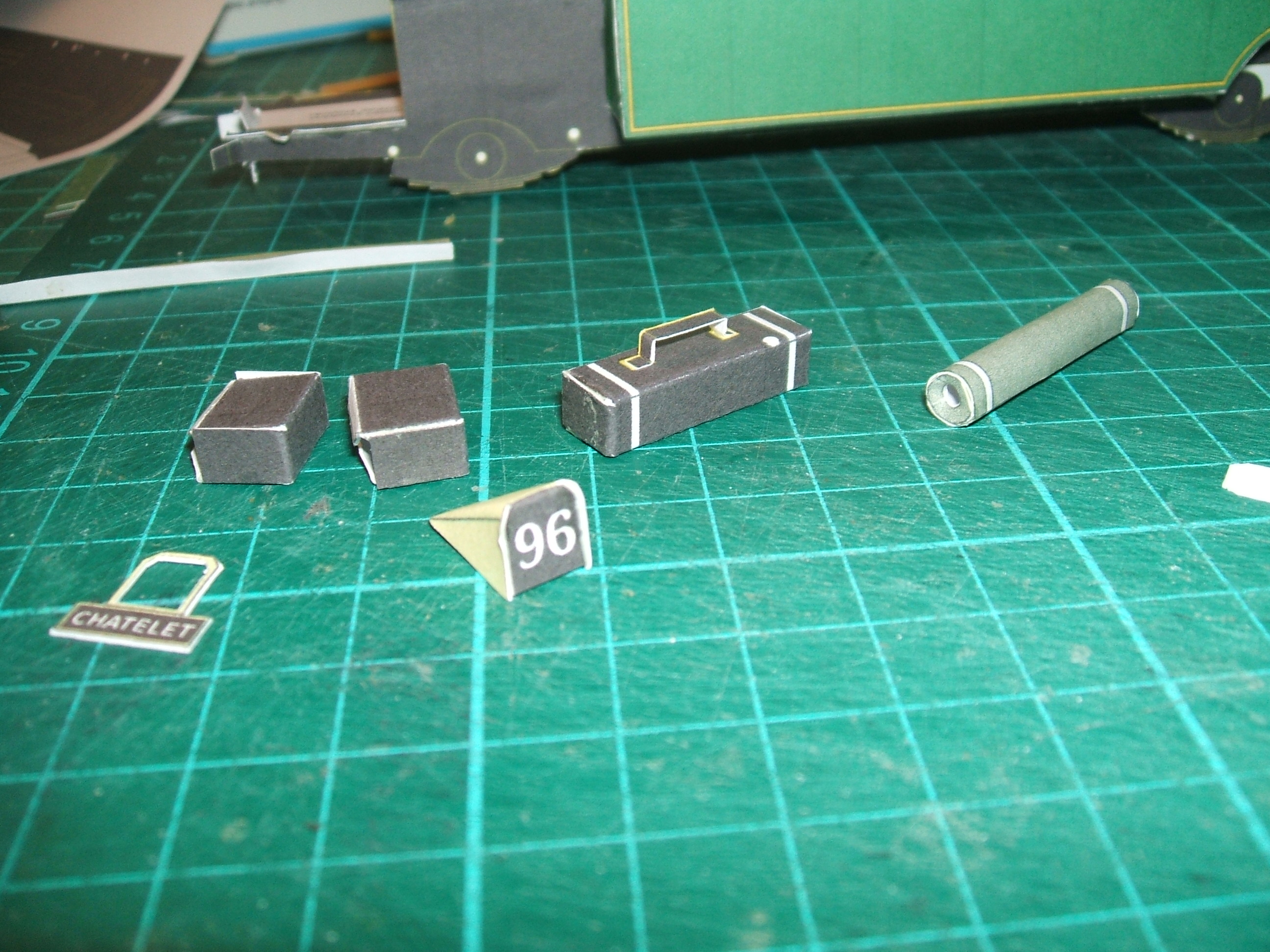 On va coller les passages de roues arrières puis la caisse. Avec la caisse. Noter le collage des cloisons Av Ar; les languettes de collage sont sur la cloison à l'avant. La cloison s'insère bien sous le toit. À l'arrière, les languettes sont sur le toit, du coup la cloison rentre moins bien et la fente sera plus visible. La planche est corrigée. On colle la languette arrière en bas sur la cloison puis on fait basculer la caisse vers l'avant en vérifiant que toutes les languettes passent bien à l'intérieur. Faites le à blanc, sinon il faudra réimprimer une planche. Et la voila en place. Pendant que ça sèche, on réalise quelques détails, les deux boites , le réservoir (du moins la partie qui se voit), l'afficheur du numéro de ligne. La sorte de poignée sur le réservoir est là pour l'écarter du plancher. Le silencieux est collé bord à bord, mais si c'est trop difficile , utilisez la languette ajoutée. On fait le tube puis on rapporte les extrémités. Une fois bien sec, on perce pour ajouter les tuyaux faits dans du papier 80g. On le montera comme sur la photo à la fin du montage des roues. Voilà pour ce post