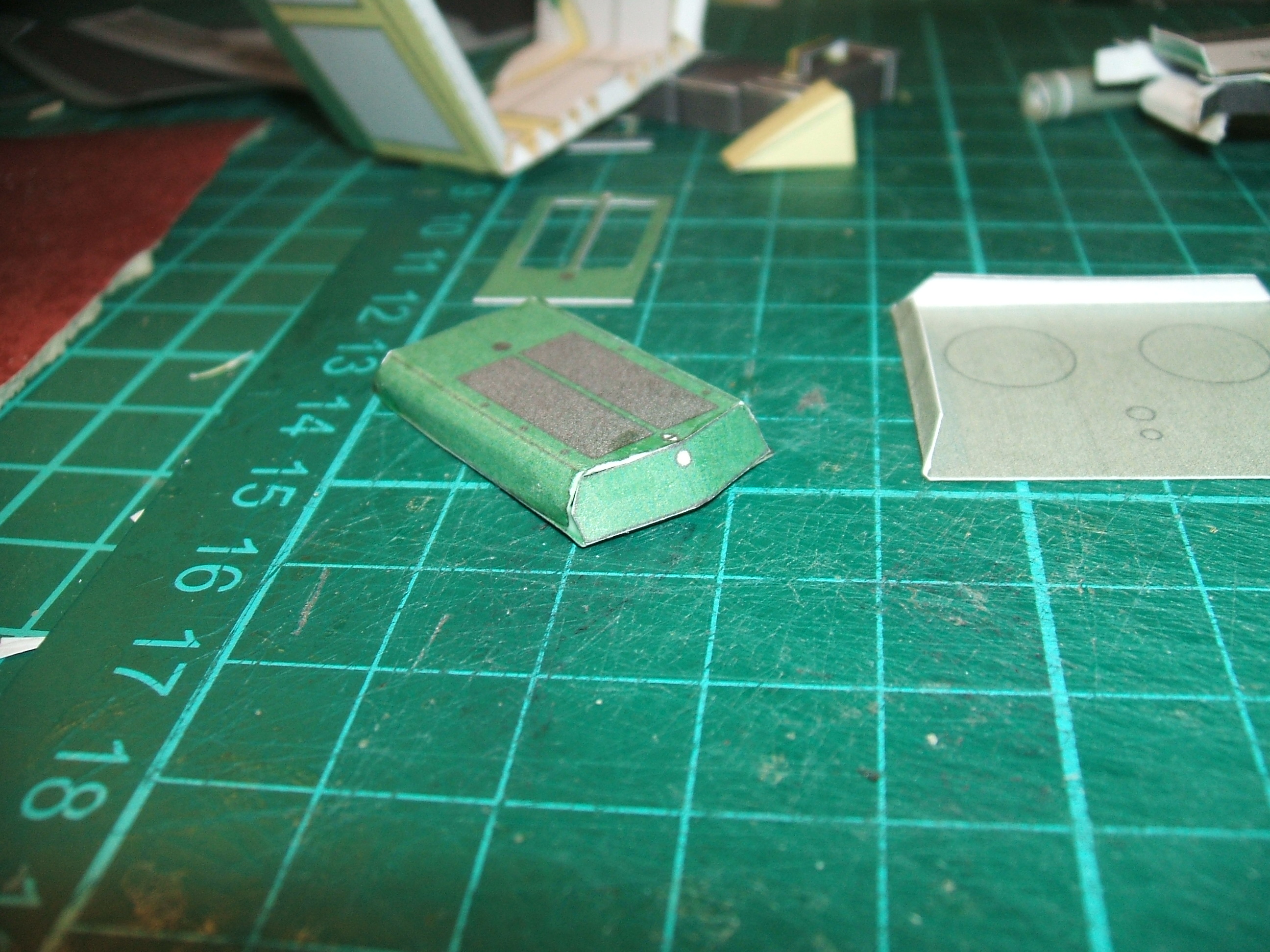 On marque le pli des languettes et on colle les parois sur la face arrière de la caisse. C'est après avoir soigneusement fini le collage des deux côtés tout autour de la plateforme que j'ai vu qu'ils étaient trop courts et trop bas (une erreur de choix d'échelle dans les conversions!). Je les ai donc découpées, remplacées par des pièces à la bonne dimension. La rampe arrive bien au niveau du bas des fenêtres. On voit sur cette photo les deux extrémités du toit et la découpe des languettes de collage. J'y reviendrai plus tard. D'abord les phares