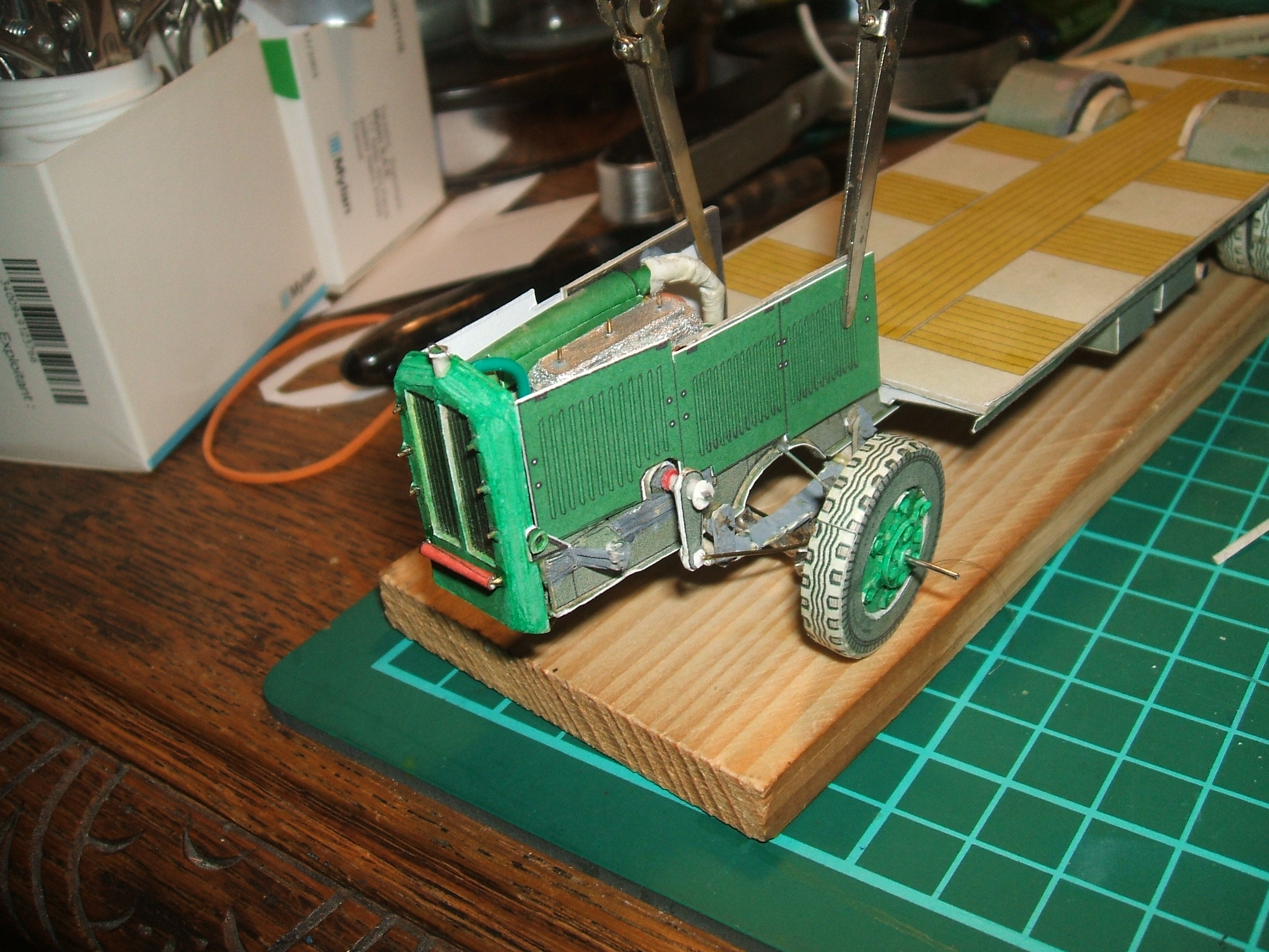 Notez la forme de l'entretoise avant du châssis sur la photo précédente. Le trou correspond à celui du radiateur pour le passage de la manivelle. Si quelqu'un veut savoir comment faire facilement, vite et bien des tubes en papier assez bien finis, il peut le demander, je ferai un petit message spécial.