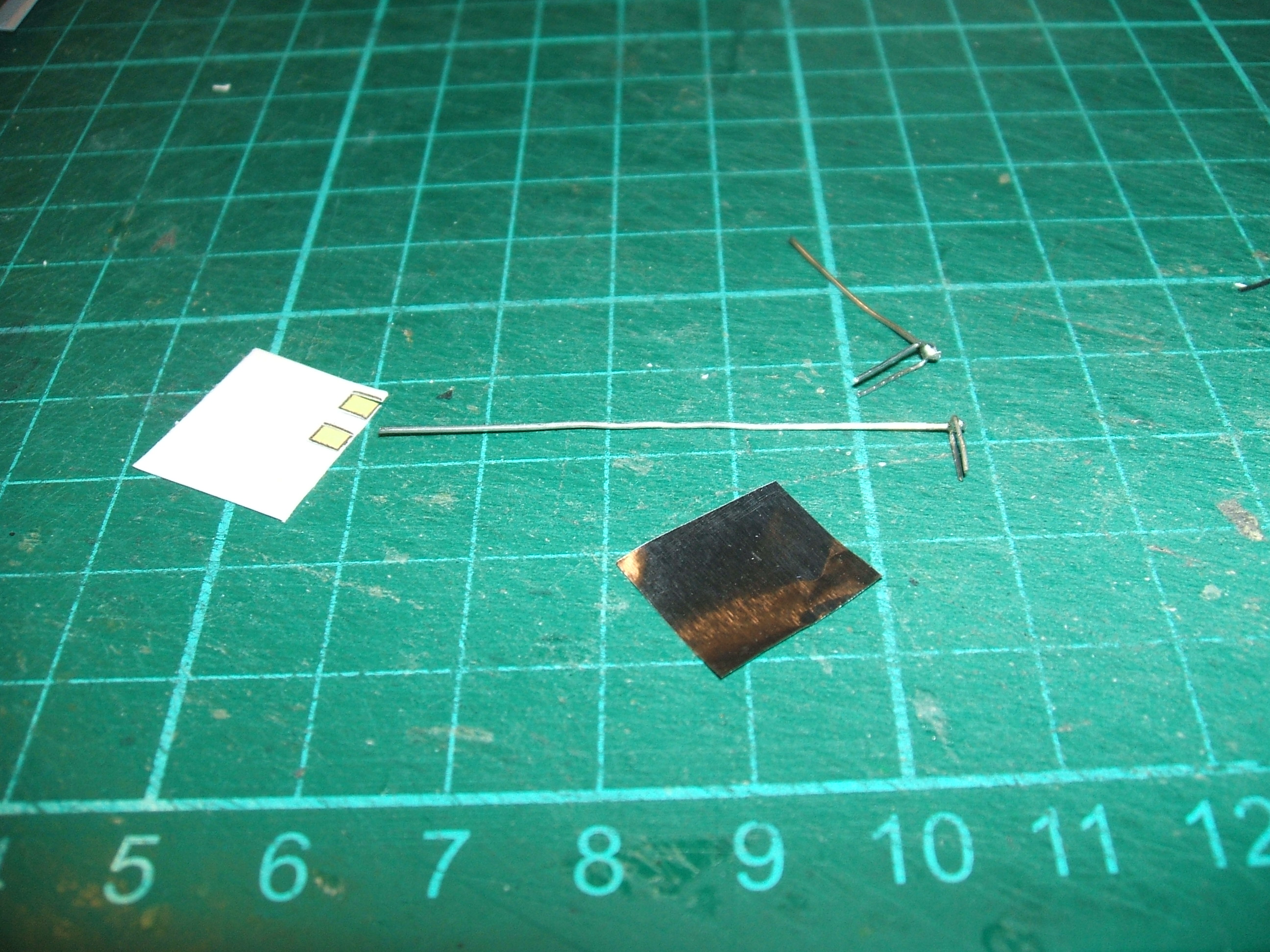 Voici le matériel pour les rétroviseurs: les supports (soudés), le dos en carton, la face réfléchissante en papier chocolat poliOn colle le papier alu sur le carton et on y collera les supports. Le tout sera mis en place. Faire en sorte qu'ils ne dépassent pas de la future caisse pour éviter le les casser. J'en ai cassé un, réparé à la cyanolit gel, ça tient, mais un peu de résine viendra le renforcer.