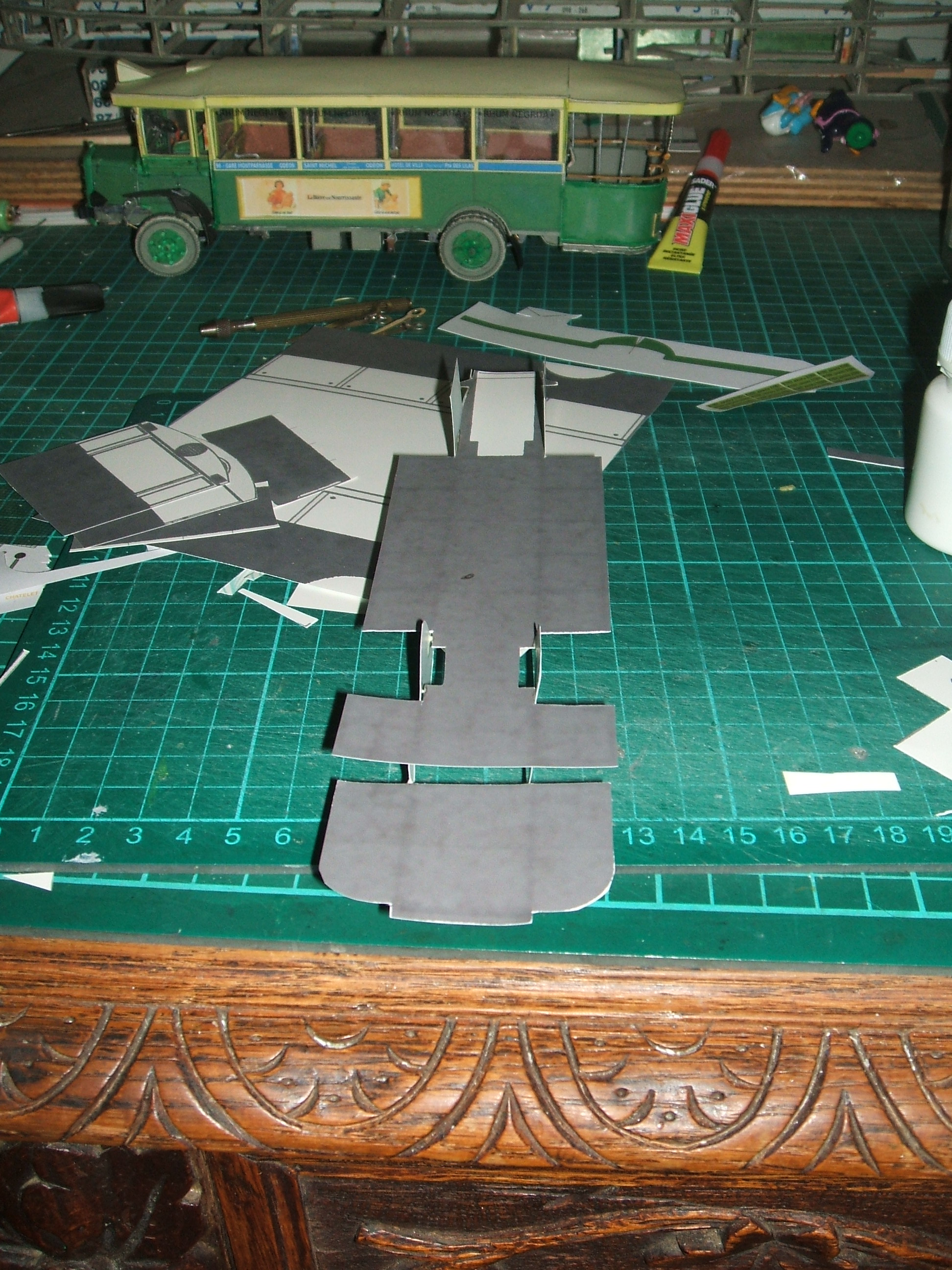on monte une cabine à partir des planches du modèle détaillé (cabine extérieure; planche 10) avec un gabarit courbe vers le milieu, on colle les cloisons avant et arrière et on fixe le tout sur le châssis Les pièces s'ajustent bien