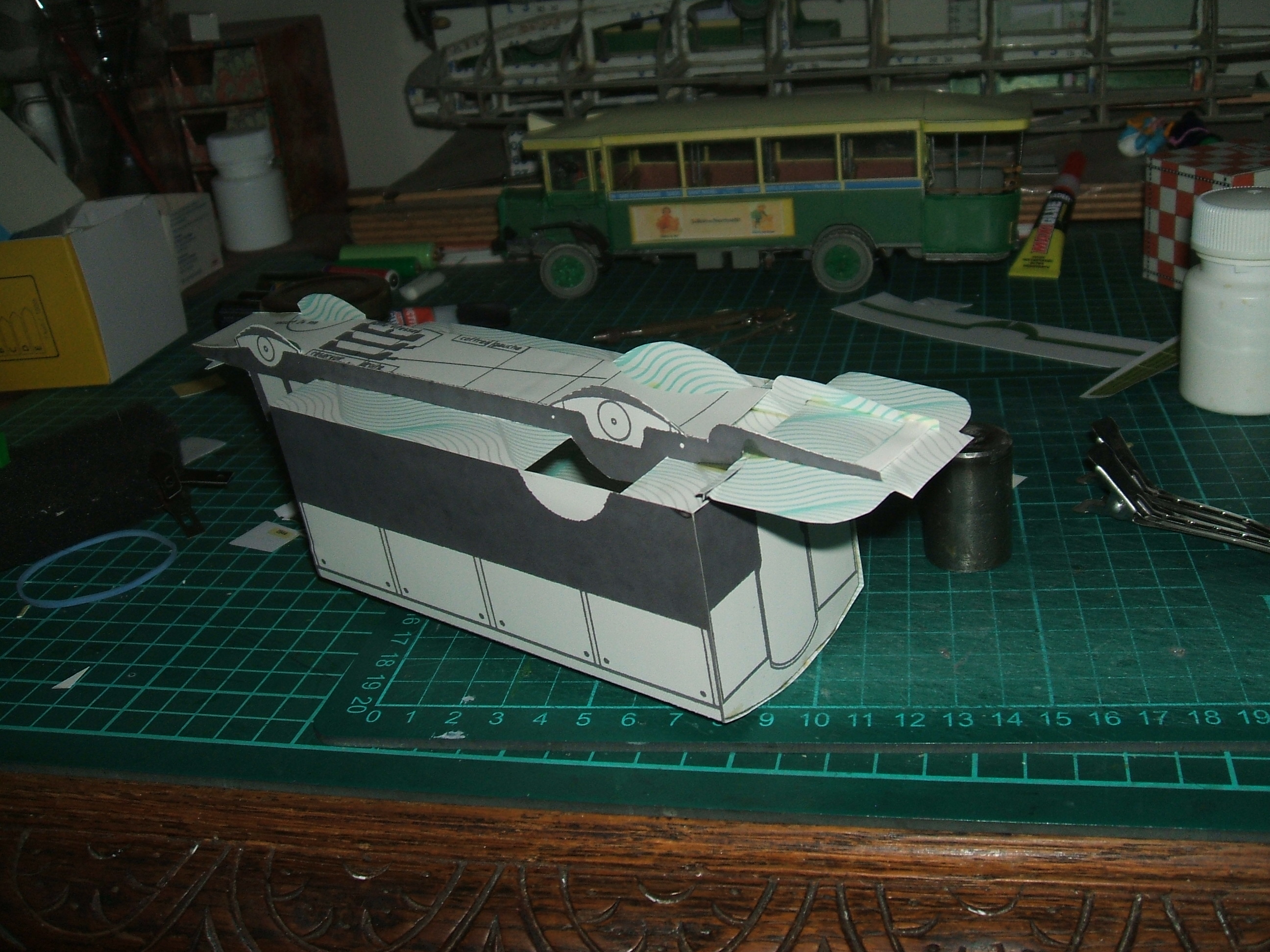 on monte une cabine à partir des planches du modèle détaillé (cabine extérieure; planche 10) avec un gabarit courbe vers le milieu, on colle les cloisons avant et arrière et on fixe le tout sur le châssis Les pièces s'ajustent bien