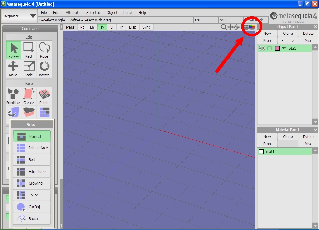 Tout d'abord ouvrir metasequoia (perso j'utilise la version 4.5.7, ce n'est pas la dernière mais c'est pareil), puis cliquez sur le petit icone 4 écrans en couleur comme montrer sur l'image :