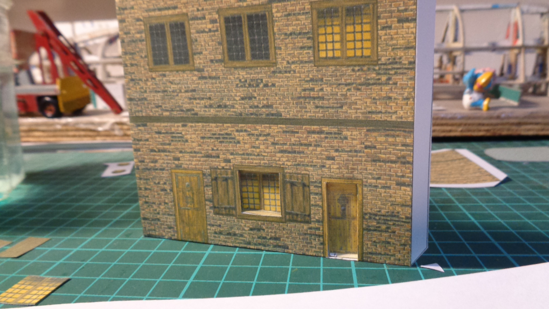 Et la fin du montage du moulin arrive; il y a encore des défauts (blancs sous les toits, tranches à colorer). Les plupart sont corrigés, les reprises ne sont pas faites pour qu'on les remarque. On voit la roue sous l'arche.