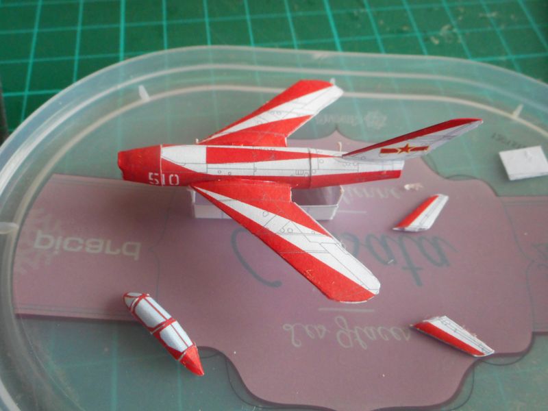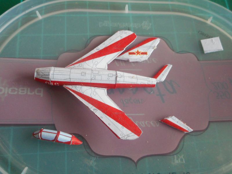 Photo rigolote où on voit 4 poutres dont une pliée en Z et sans colle. Elles serviront pour d'autres MiG-17/JJ-5. La poutre est juste la partie centrale matérialisée par le rectangle rose. Du coup, on peut en faire 3 avec une seule pièce. On doit la plier au milieu car les ailes ont un dièdre négatif.
