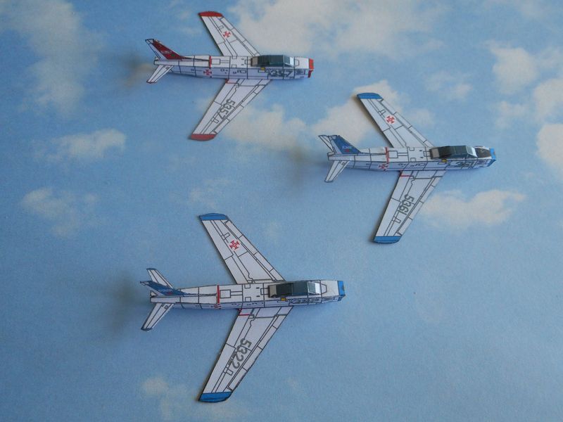 Il y a 3 F-86F portugais, 2 dans la livrée alu des années 60 et un la livrée gris-bleu des années 70. Tous les trois on l'aile allongée des F-86F block 40.