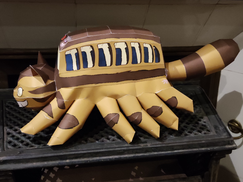 J'ai reçu quelques pressions extérieures pour finir ma nouvelle maquette... La voila, les fans de Miyazaki reconnaitront le Chat-bus présent dans "mon voisin totoro". La tête et le corps n'ont posé aucune difficulté particulière, mais les pattes et surtout la fermeture du ventre ont été une bonne prise de tête !
