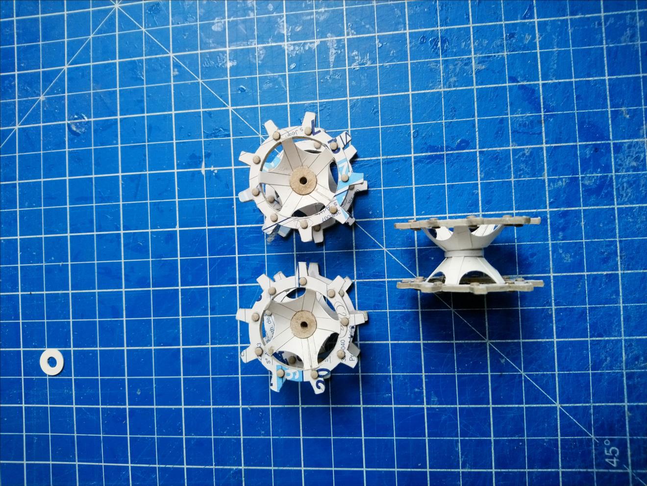 Suite de la construction avec les poulies tendeuses qui sont composées de cercles superposés. Je m'y suis pris à deux fois pour la confection des poulies tendeuses : j'avais achevé un premier jeu de quatre poulies prêtes à être posées mais le rendu ne me satisfaisait pas. J'ai donc dû me résoudre à recommencer tout à partir du commencement.
