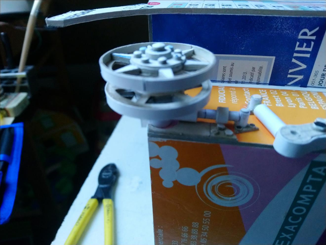 Les chenilles ont été peintes et montées : Les trappes d'accès au moteur sont achevées et les supports des crochets ont été ajoutés : Les structures des phares sont réalisées : A suivre...