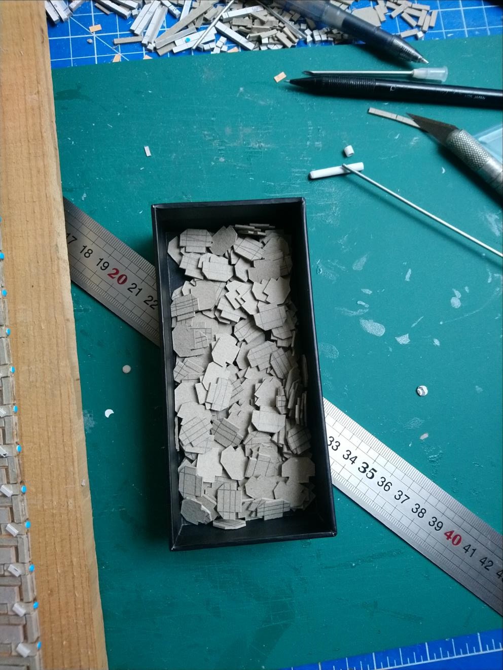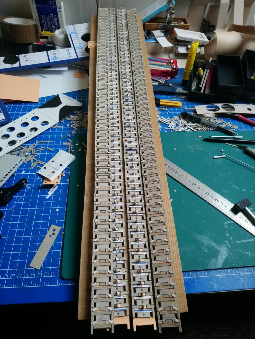Les puristes fabriquent les chenilles maillon par maillon. Pour ma part, j'ai opté pour "l'habillage" d'une trame de carton léger pliée au niveau de chaque maillon avec des morceaux de cartons d'environ 1mm d'épaisseur de tailles différentes comme le montrent les photos ci-après : Au stade le plus avancé correspondant à la chenille figurant en haut de la seconde photo, chaque maillon comporte déjà 15 pièces (il y a 54 maillons par chenille....)