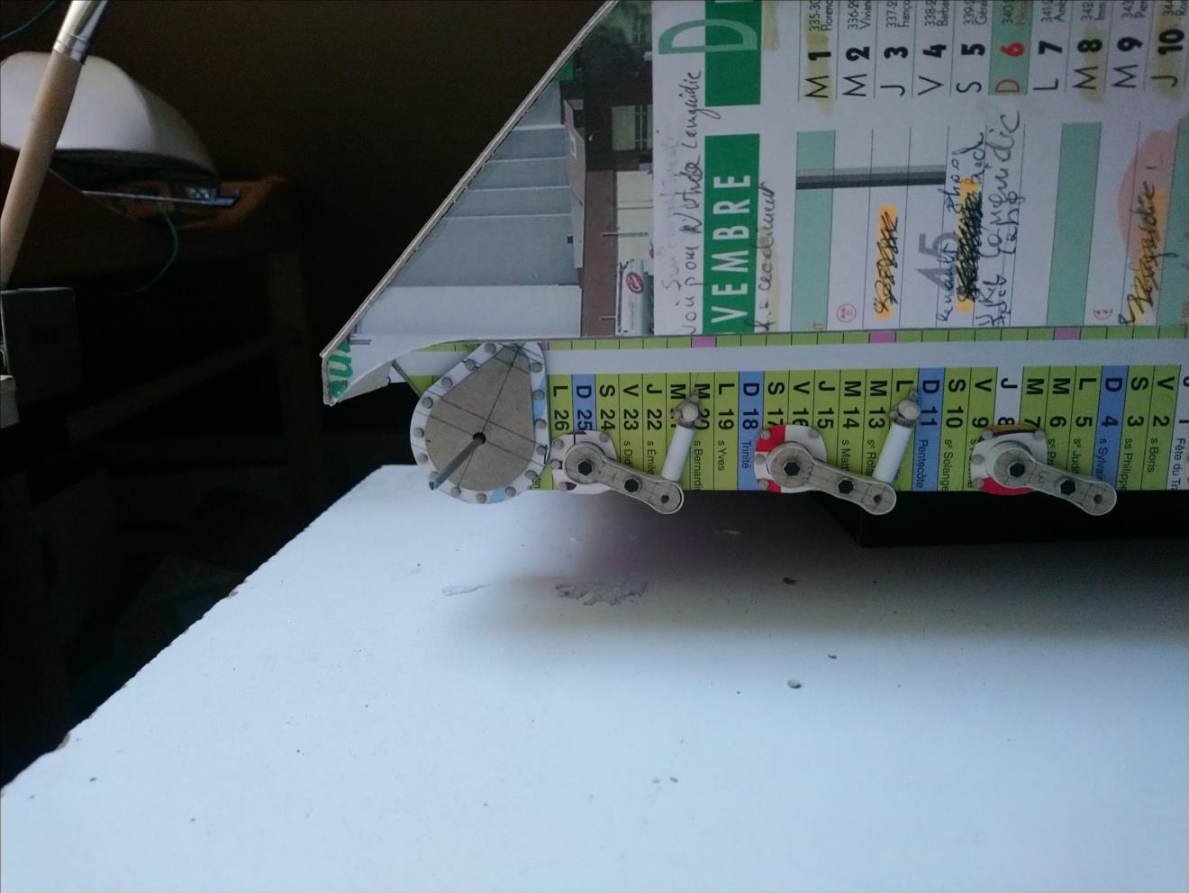Suite de la construction avec les mécanismes de tension des poulies. Il s'agit là d'un tube de papier sur lequel sont roulés deux autres tubes de longueurs différentes.
