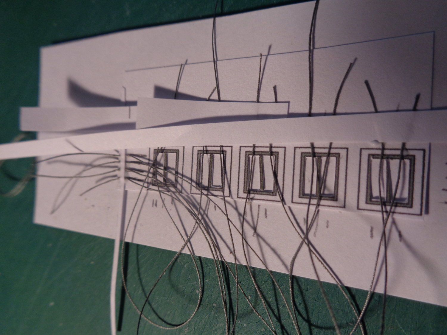 J'ai utilisé une autre méthode que celle employée dans d'autres montages précédemment décrits pour faire les grilles sur les petites fenêtres. Les fils sont collés d'un côté à la colle à bois, puis une fois secs, tendus et collés de l'autre côté , toujours à la colle à bois. Elle prend très vite et en emprisonnant le fil entre deux papiers, c'est encore plus rapide Les plaquages étant secs, le corps de bâtiment est assemblé noter les encastrements.