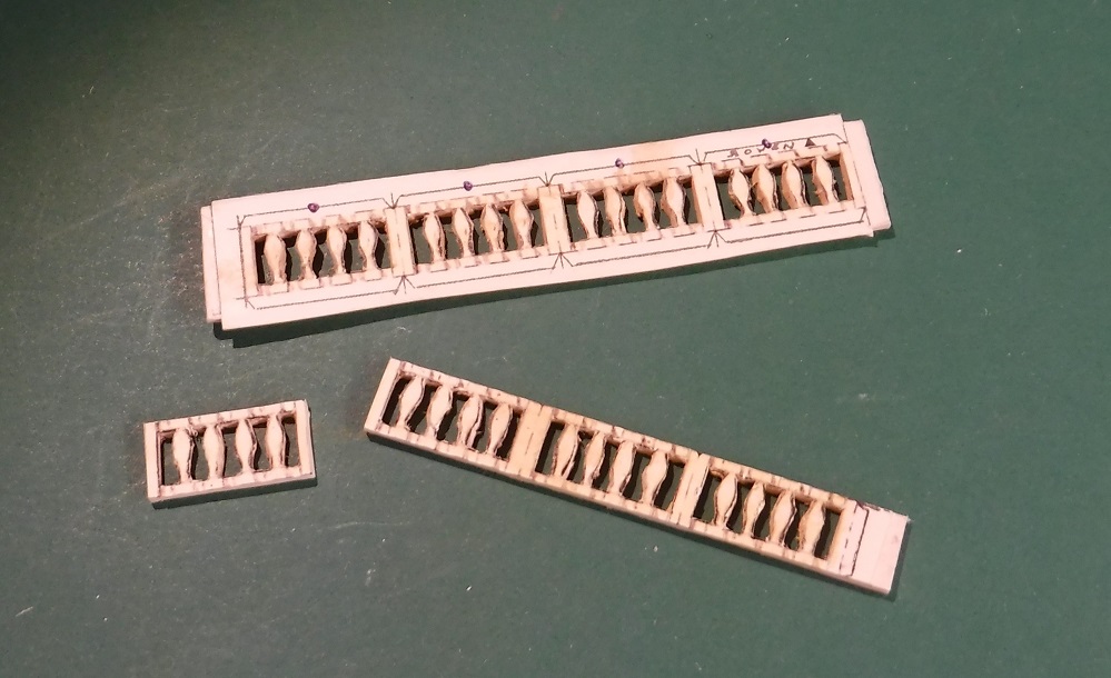 - ... maintenant les petites colonnes pour la balustrade, en enlevant les languettes ici et en les collant bout à bout