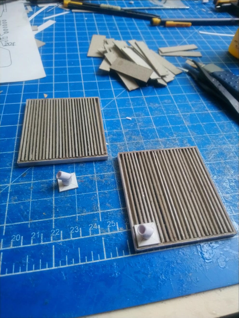 Suite de la construction avec les pelles présente à l'avant : Puis pose des points d'attache sur lesquels viendra le lien maintenant la pelle en place : Construction des grilles d'aération du moteur : Construction du pot d'échappement : A suivre...