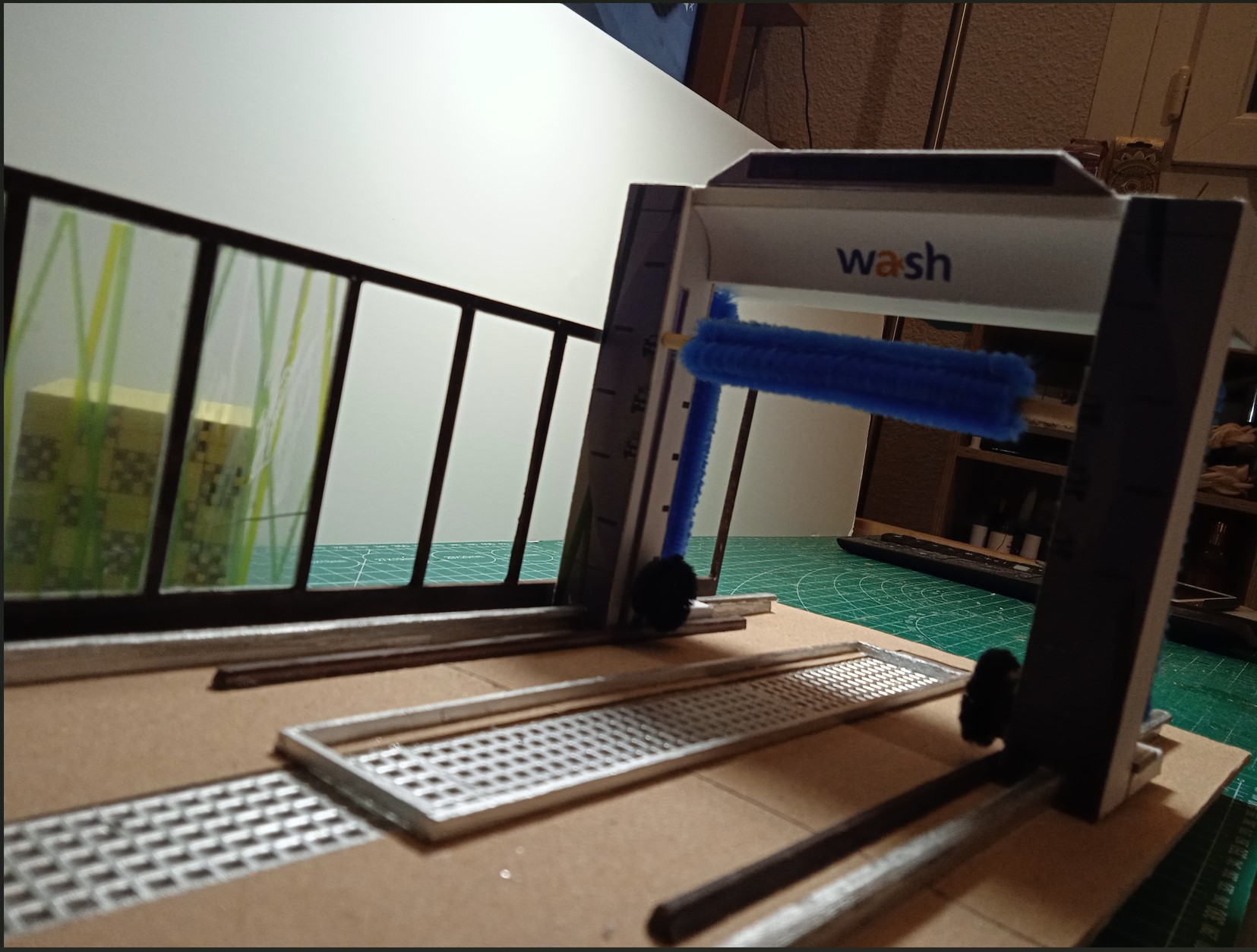 Je vous présente une partie du coin lavage automobile , le lavage a rouleau , le tout est mobile mais il manque encore des pièces que je n'ai pas fini et les rouleaux sont provisoirement posés d'où les calles carré au bas.