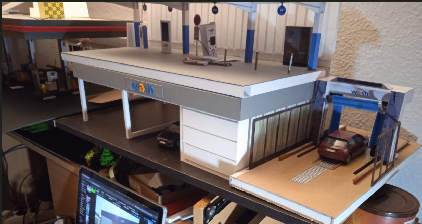 Je vous présente une partie du coin lavage automobile , le lavage a rouleau , le tout est mobile mais il manque encore des pièces que je n'ai pas fini et les rouleaux sont provisoirement posés d'où les calles carré au bas.