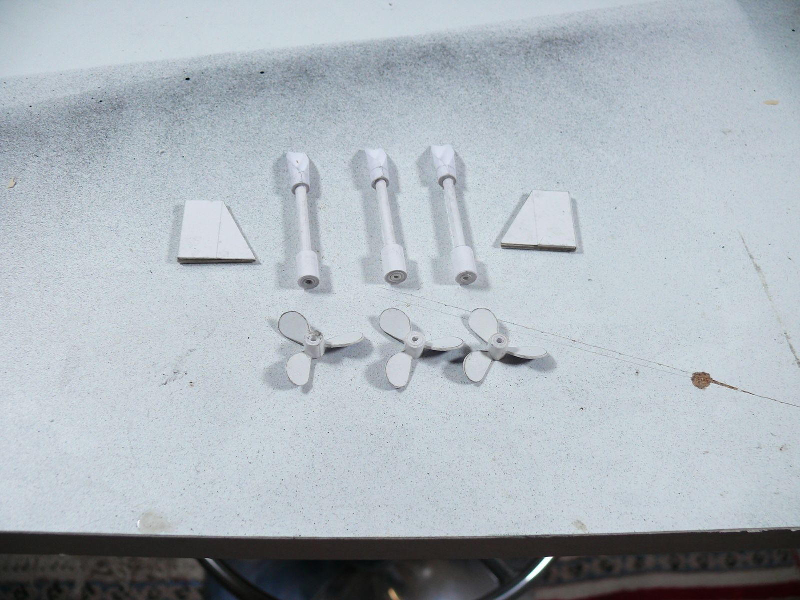 Je ne me risquerai pas à tenter de réparer les erreurs commises sur la coque ou les hélices en raison du fait 1) que toute tentative de correction se solderait par la destruction du modèle vu que le collage a été effectué à la colle cyanoacrylate 2) que de toute façon, il s'agit d'un modèle test me permettant d'appréhender les difficultés de la construction de bateaux en carton.