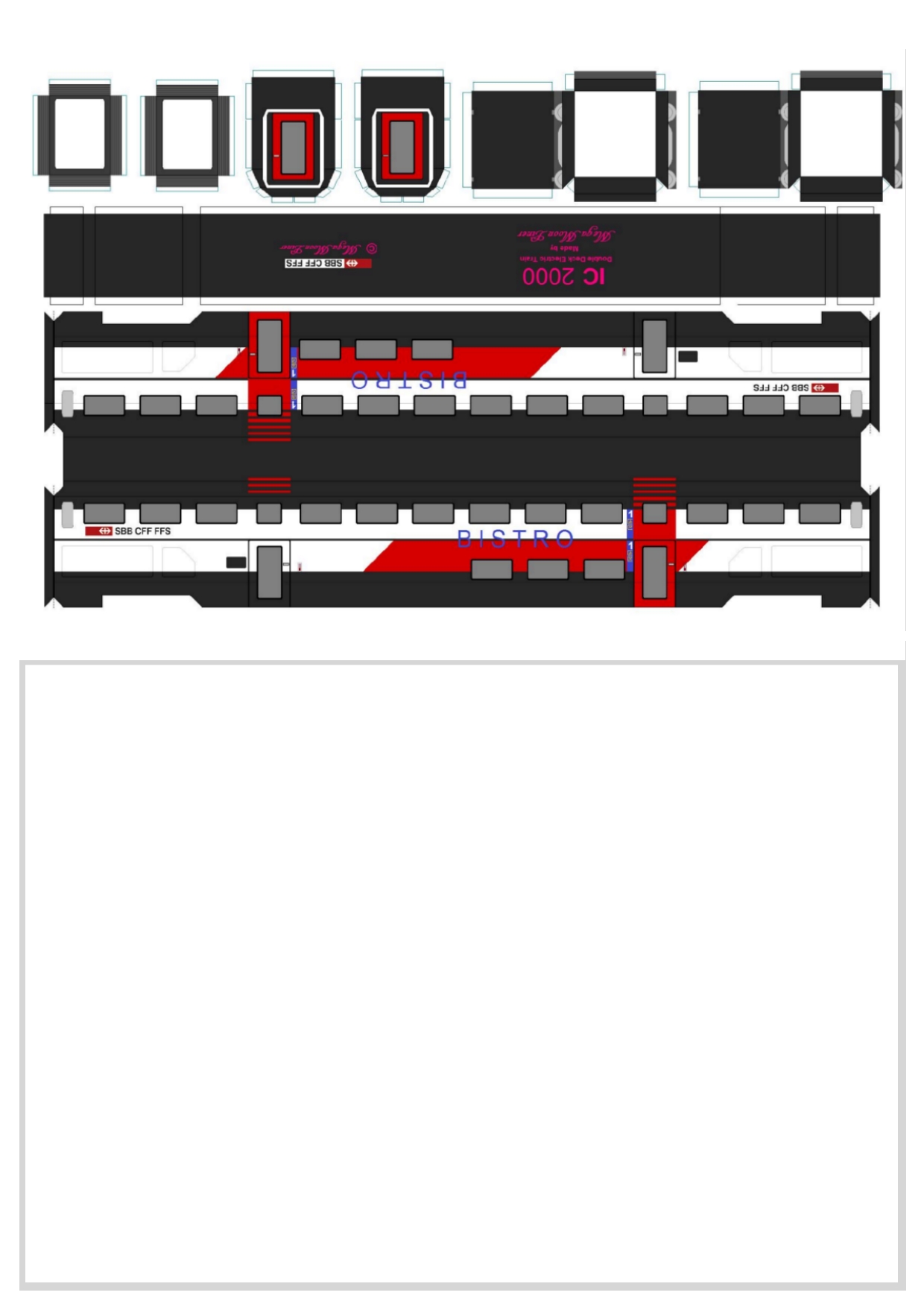 Je vais rédimensionner la Lok 2000, développée antérieurement, pour compléter la formation. Pour plus d'informations, visitez le site des CFF: http://sbb.ch/, et visitez bientôt ce lien Wikipedia, pour des infos précises: http://fr.wikipedia.org/wiki/IC_2000