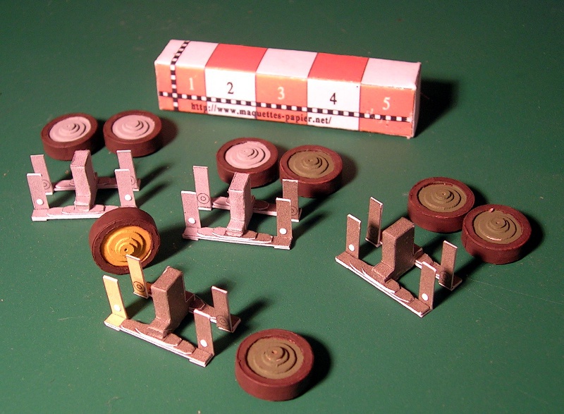 Puis les rouleaux porteurs : Et en fin les barbotins : Juste pour clarifier l'instruction de montage : on colle ensemble les pièces 16a, 16b et 16c, puis on découpe "les dents".