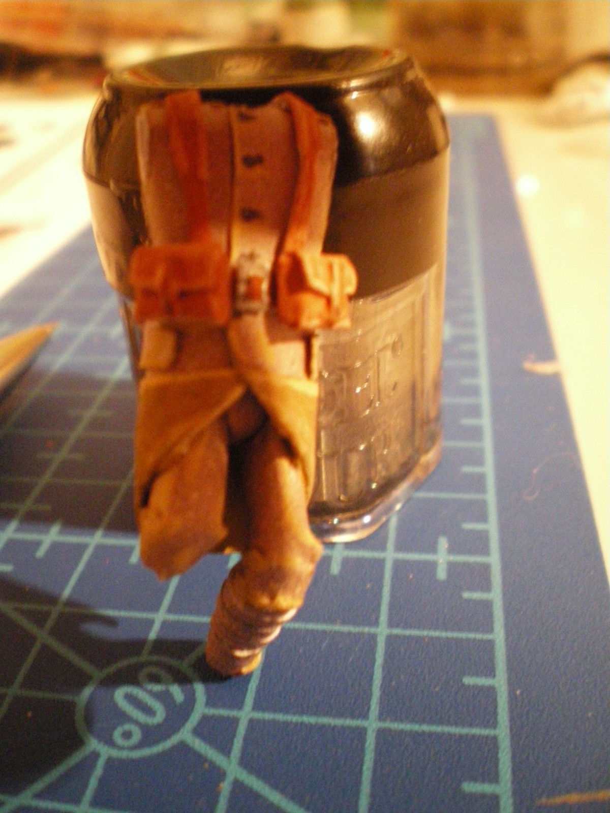 Je vous fais parvenir de nouvelles photos. j'ai dessiné et fabriqué un nouveau casque. En effet, le premier était loin de me satisfaire. Ensuite, j'ai surtout travaillé sur les couleurs de la figurine : ombres etc. Les boutons ont été ajoutés.