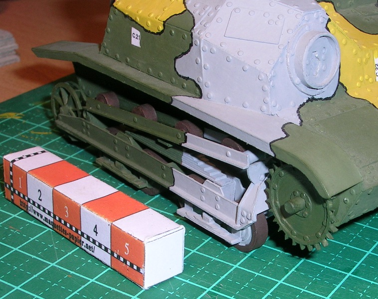 Aujourd'hui, j'ai installé les chenilles, les outils, la mitrailleuse et la porte-mitrailleuse. J'ai aussi essayé de mettre un peu de tension (le poids de chenille) sur les chenilles (voir le conseil de jeanma), mais je n'ai pas réussi. Heureusement, les photos de l’époque montre, que les chenilles étais plutôt tendues (voir ici).