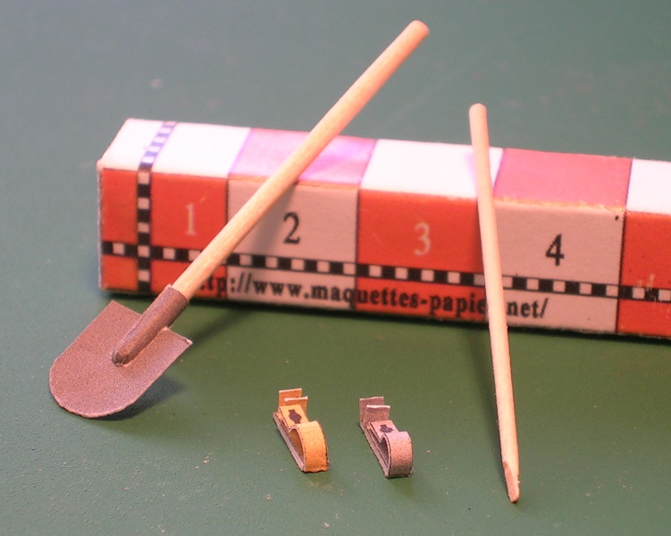 Et les derniers pieces... Une pelle, une pince-monseigneur, et leur support : Maintenant il reste que peindre tout ça et l'assembler sur le char!