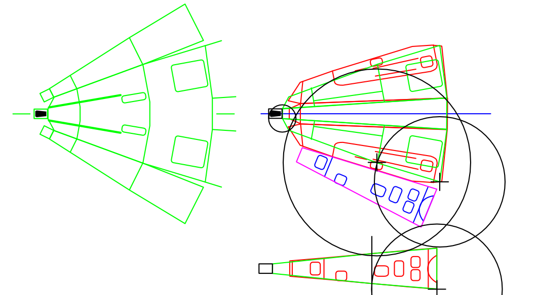 Pour le nez, c'est plus compliqué. La première chose est de de dessiner un triangle sur le profil du plan trois vues réduit à l'échelle puis de l'adapter sur le profil du modèle. Le coté du haut me donnera le rayon du camembert final. Ensuite, faire d'autres triangles (isocèles cette fois) dont la base s'adapte bien aux vues de dessous et dessus du nez du modèle. Ensuite on assemble les vues, ce qui permettra de tracer le camembert qui constituera le véritable nez. Parfois, je ne trace pas le camenbert et fusionne simplement les differents morceaux en supprimant certains côtés (nez des Mirage 5F, IIIBE, IIIR, Kfir).