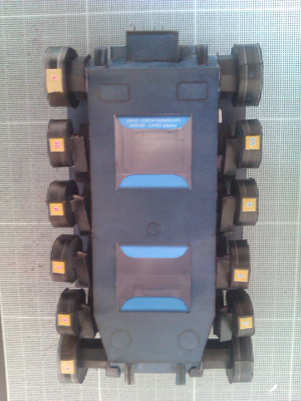 Prochaine étape avant la réalisation des chenilles: finition de la caisse avec coloriage des champs, ébarbage des petits points de colle, ponçage...