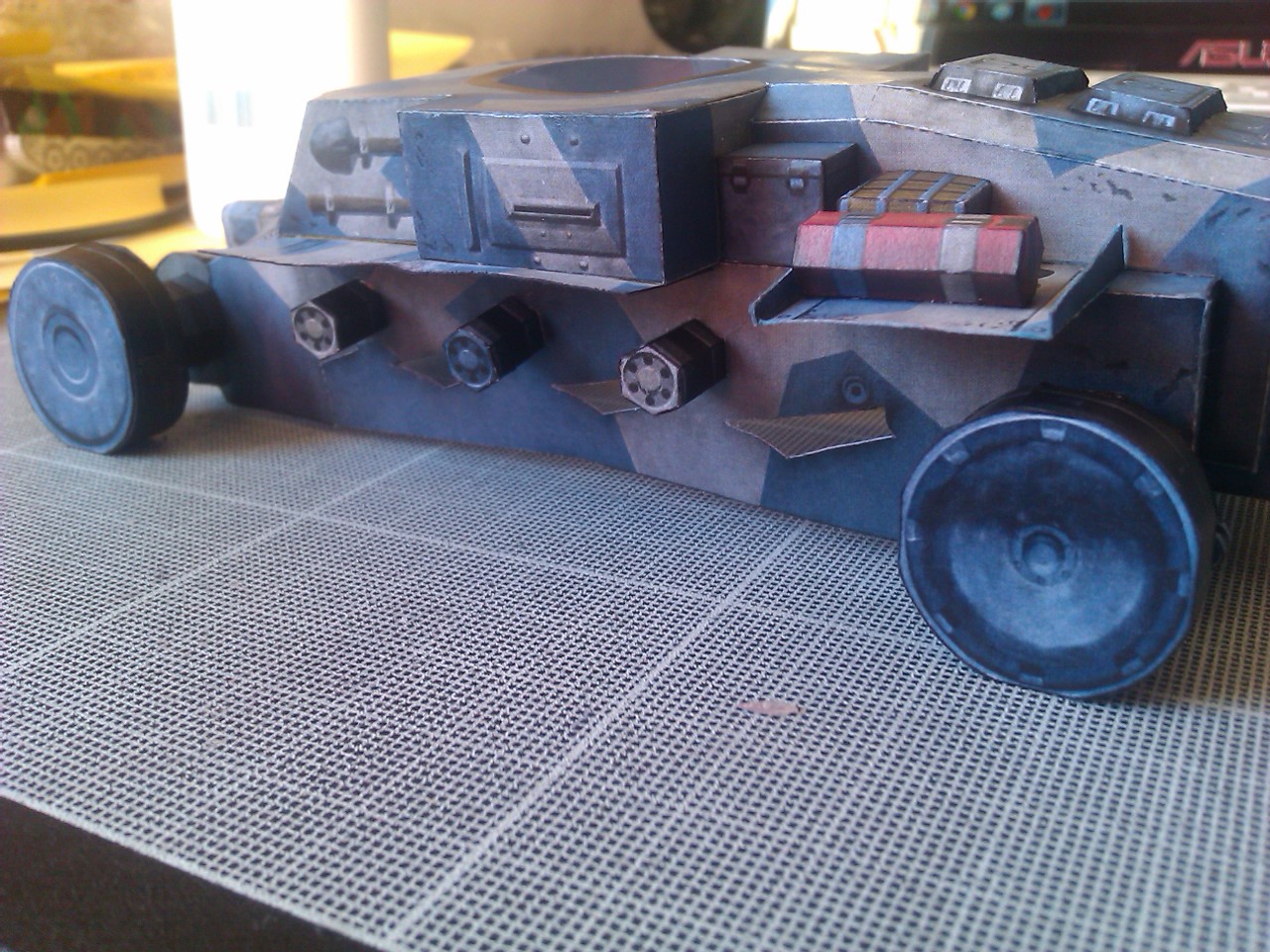Prochaine étape avant la réalisation des chenilles: finition de la caisse avec coloriage des champs, ébarbage des petits points de colle, ponçage...