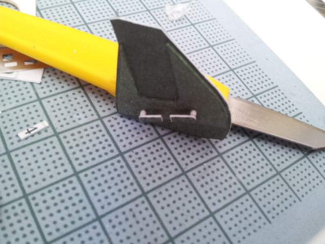 La partie blanche, entre les 2 pattes, devra être supprimer pour laisser passer la jambe de train La lame de rasoir que j' utilise pour cette étape provient de rasoir jetable.